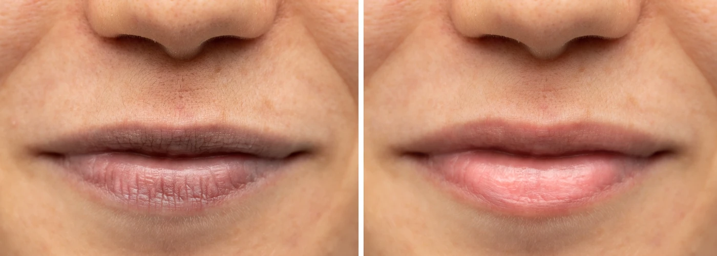 Lip lightening is a cosmetic procedure used to lighten or remove the dark pigment from the lips, making them appear more even-toned. Some people tend to have dark lips due to hyperpigmentation, which can also be caused by an unhealthy lifestyle or poor oral hygiene. This leads to the buildup of dead skin and bacteria on the lips, resulting in darkening. Other factors that may cause dark lips include caffeine consumption, excessive smoking, sunlight exposure, constant lip biting, medical conditions, and sometimes genetic factors. Dehydration can also contribute to dark lips.